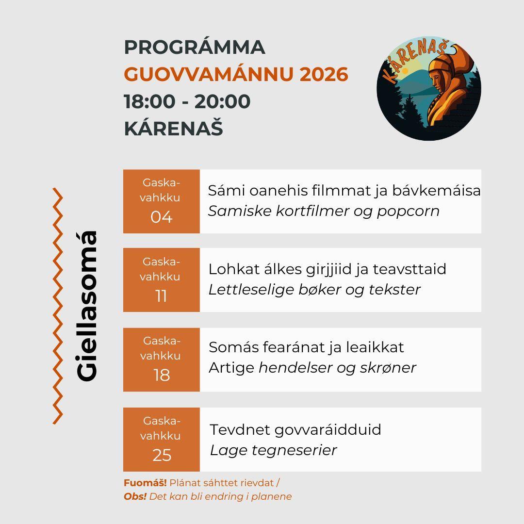 Giellasomá - Samisk er gøy! Språktreff på onsdager kl. 18-20. Se program nedenfor.