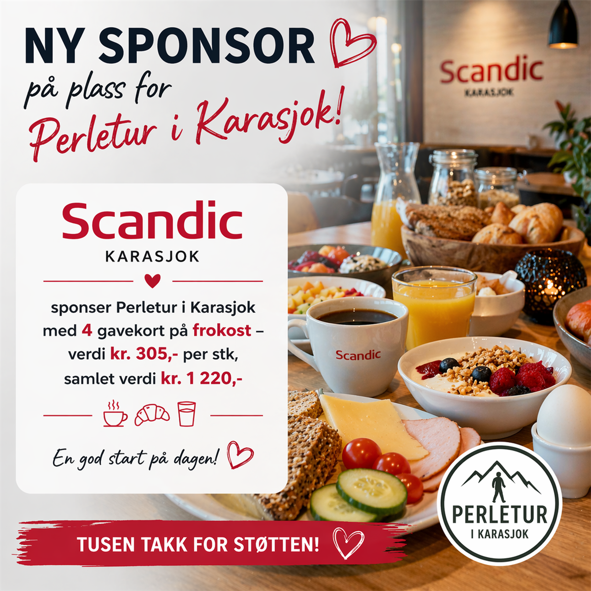 Scandic Karasjok sponser Perletur i Karasjok med 4 gavekort på frokost – verdi kr. 305,- per stk, samlet verdi kr. 1 220,-