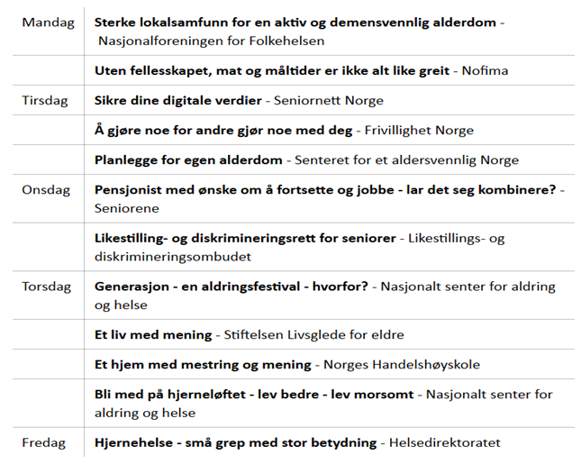 Aldersvennlig Norge arrangerer flere digitale foredrag denne uken som de har kaldt «Eldreuka». Eldreuka arrangeres som en del av Program for et aldersvennlig Norge 2030, og som et av tiltakene i Bo trygt hjemme-reformen. Under kan man se alle foredragene som skal være denne uke. Flere av dem vil det komme opptak av som man kan se i ettertid også. Link til foredrag finner man på aldersvennling Norge sine sider: Eldreuka 2025 - Aldersvennlig. De to digitale foredragene som er satt opp onsdag 1. oktober vil vises på storskjerm i Karasjok.