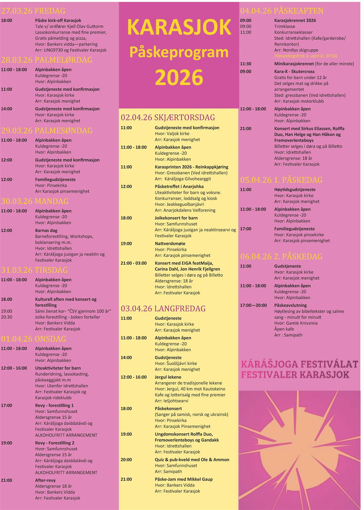 Påskefestivalen 2026!Festivaler Karasjok i samarbeid med lokale bedrifter, lag og foreninger arrangerer årets påskefestival!Vi håper at kommunens innbyggere og besøkende deltar på de ulike arrangementene, her er noe for alle aldersgrupper. Ønsker du å kjøpe billett til et av arrangementene? Det gjør du på billetto.no Her kan du laste ned Påskeprogrammet i PDF- format. (PDF, 4 MB)
