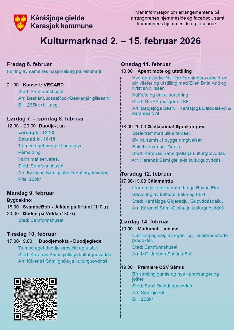 Program - Kulturmarknad 2. – 15. februar 2026 Konserter, kurs, bygdekino, markanat-messe, språk og duodji, åpne møter og feiring av Samenes nasjonaldag.Programmet for kulturmarknaden er klart. Se kommunens kalender for kulturmarknadenKulturmarknad program 20261.pdf (PDF, 796 kB) Sist endret 29.01.2026 13.00