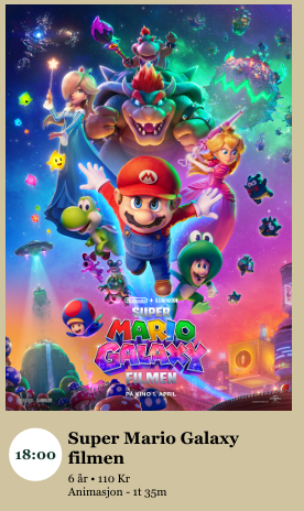 Super Mario Galaxy filmen - Bygdekino 04.05.2026Galaksen venter!Mario og Luigi begir seg ut på en reise i verdensrommet, og utforsker nye kosmiske verdener og utfordringer langt fra Soppriket de kjenner.Kl. 18.00 Alder: 6 årTid: 1t 35mPris: 110 krSted: SamfunnshusetBilletter kjøpes via bygdekinoens hjemmeside: Bygdekinoen eller på utsalgsstedet. Filminformasjon: Super Mario Galaxy filmen | Bygdekinoen Sist endret 28.04.2026 12.31