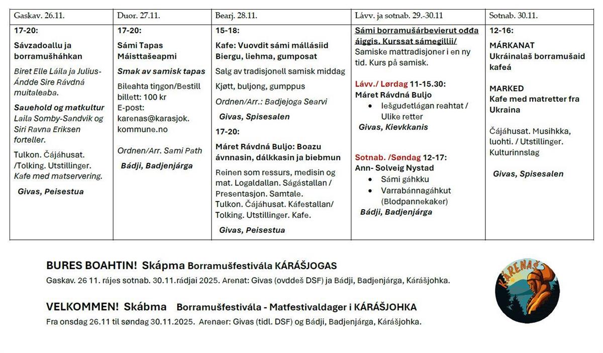 Fredag 28.11. Salg av tradisjonell middag med kjøtt, gumppus og buljong, i samarbeid med Badjejoga Searvi. Søndag 30.11. Marked. Matretter fra Ukraina. Kafe og utstillinger. Kulturinnslag.