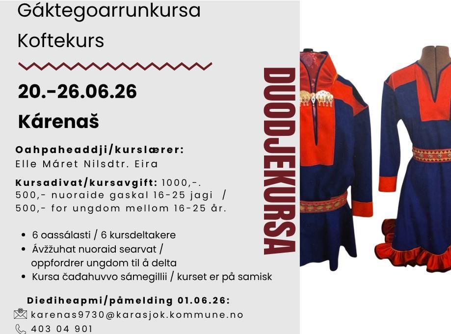 Arrangør: Kárenaš Sámi Giella- ja kulturguovddáš, Samisk Språk- og kultursenter. Vil du vite mer om oss? Sjekk Kárenaš sin FB-side her Vi annonserer våre kurs/tilbud også her