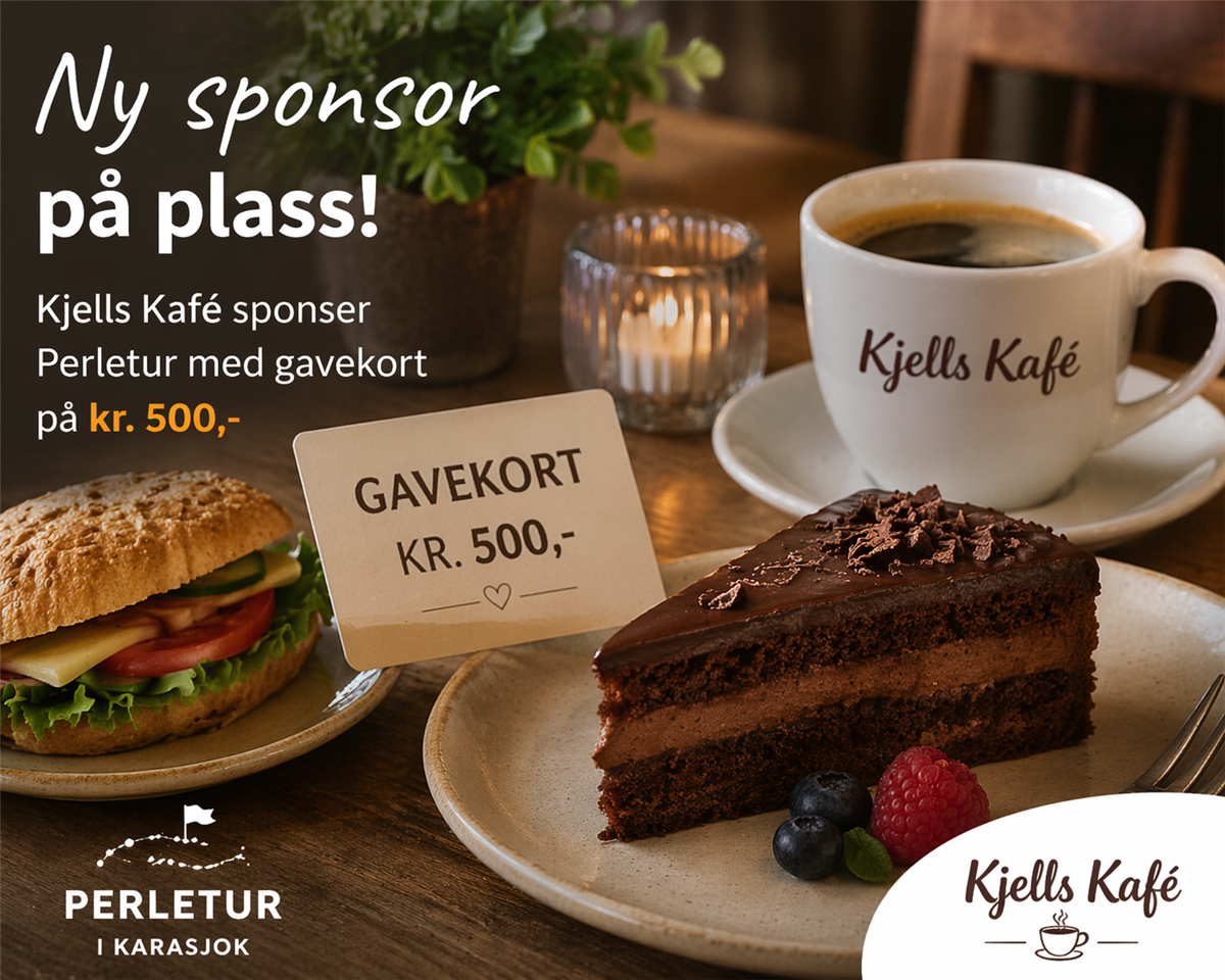 Kjells Kafé sponse bearalmátkkážiidda Kárášjogas kr. 500,- árvosaš skeaŋkakoartta– justa fal hearvás lunšii, gaskabeivviide dahje káfestallamii.