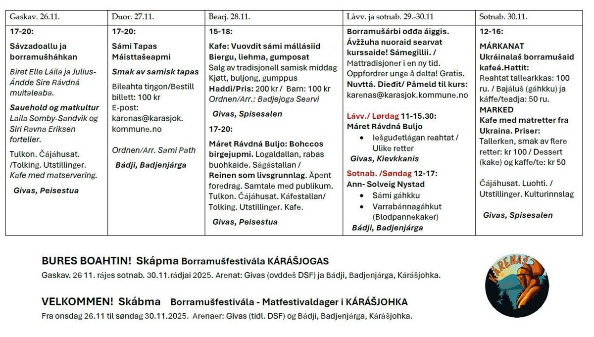 Lørdag 29. og søndag 30.11. Matkurs ved Máret Rávdná Buljo og Ann-Solveig Nystad. På samisk. Ungdom oppfordres til å delta! Gratis kurs. Forhåndspåmelding til: karenas@karasjok.kommune.no